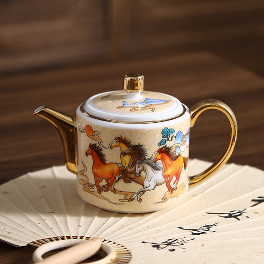 Eight Horses Gilded Teapot One Pot One Cup Kung Fu Tea Set Ceramic Light Luxury Tea Brewing Pot Gift Chinese Style Gift Box